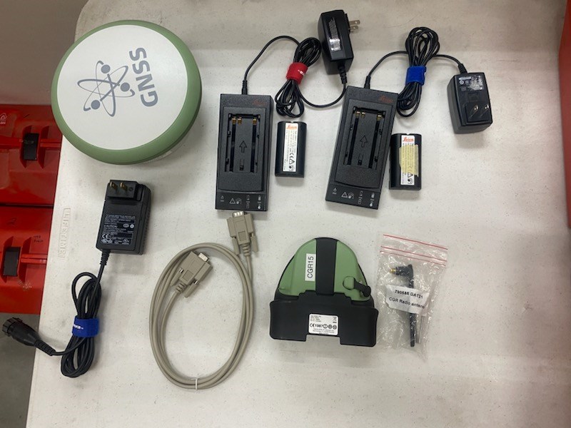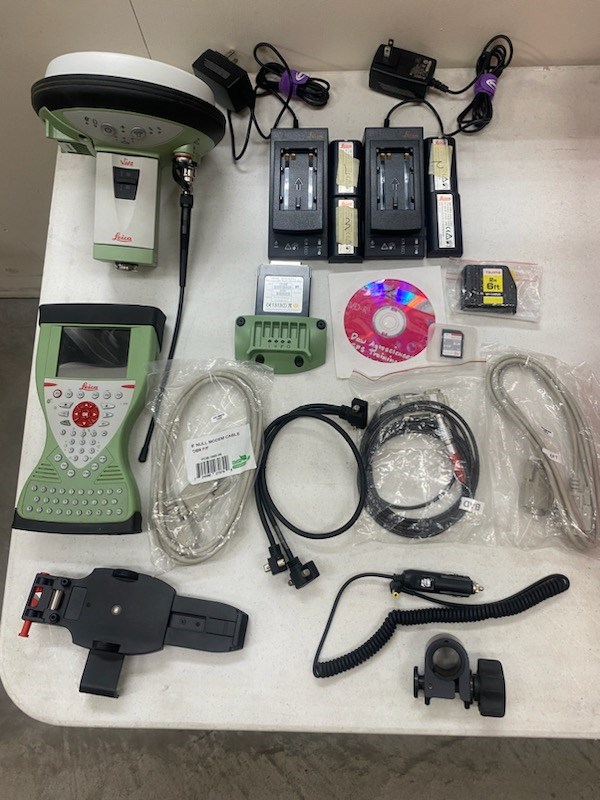 2 battery chargers 4 batteries GS15 RTK Rover Antenna SN# 1510439 CS15 data device SN#2537279 1 mount for CS15 1 pole clamp 1 tape measure 3 various data cables 1 power cord 12 volt Tripod mount with bubble level, 2 pcs plus plumb bob.