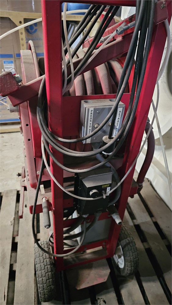 - Has hose whips on the end of a 1" hose reel that lowers it down into the bin.