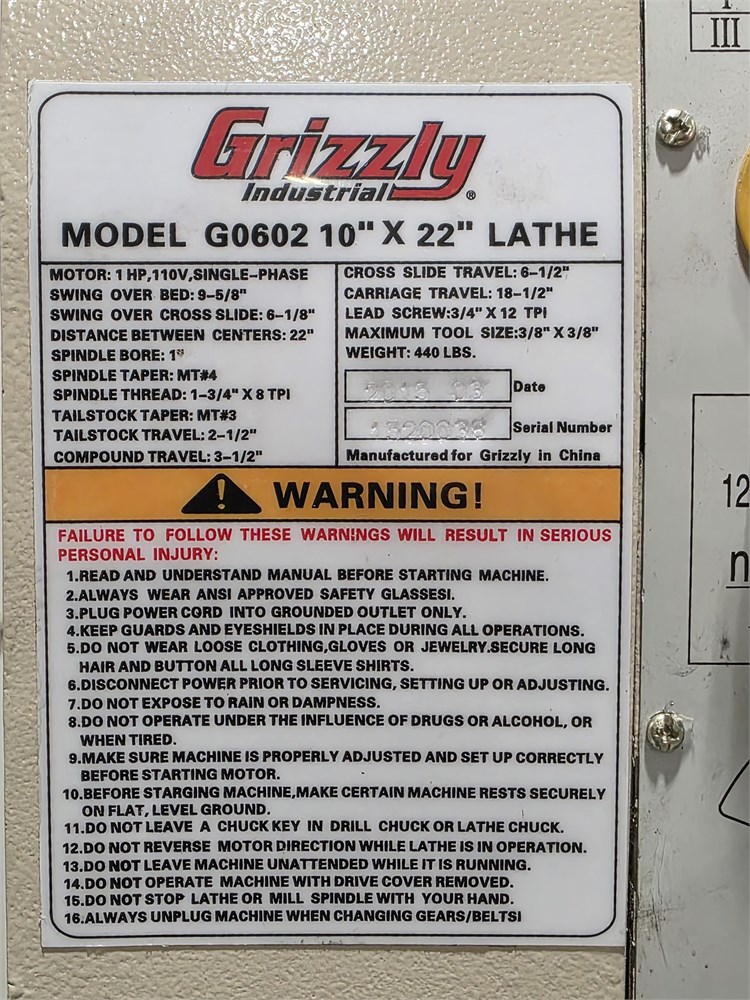 Grizzly G0602 Lathe & Base - Johnston, Iowa - (8082)