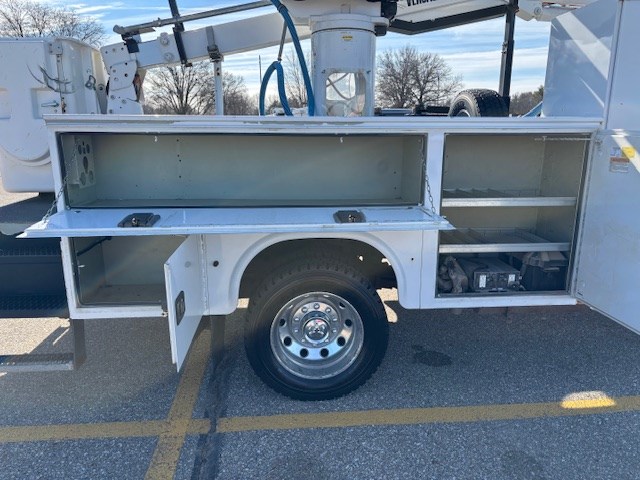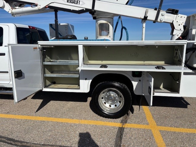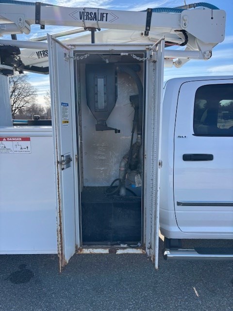 Equipment: 6.7L Cummins Diesel, Automatic Transmission, 4.88 limited slip rear end, 19,500 lb. GVWR, Bright White Exterior with Diesel Gray/Black Cloth Interior, Versalift SST-40 Aerial Lift w/ 45 ft. working height, vacuum seed sampling system, paint peeling on service body, aluminum wheels peeling