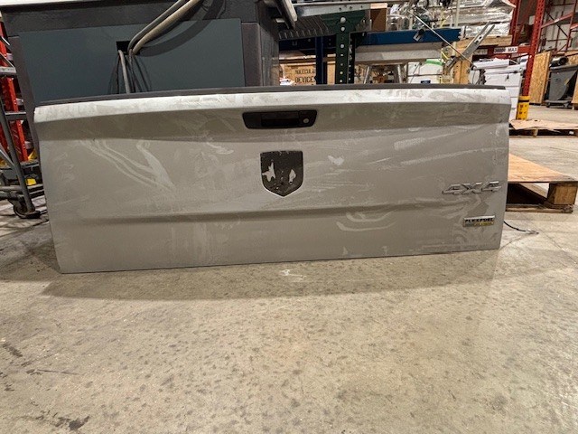 - Silver Dodge tailgate for a pickup.